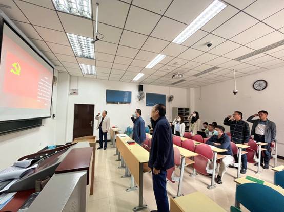 戎老师在报告中精心设计了与会全体党员重温入党誓词的环节,在李文兴书记的带领下,党员们右手握拳,深情诵读入党誓词,回顾入党的初心使命,将报告的氛围推向了高潮。