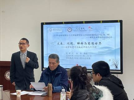 首先,朱锋刚副经理发表讲话。他介绍了筹办公司研究生人才培养质量保证计划的缘起与目的,期望通过这些活动,更加深入的为广大研究生的学习与成长提供助力。他表示,对学术研究与叙述这一主题的关注,并不仅仅在于完成学业任务,而是要引导大家进一步思考,从哲学家所构建的文本中挖掘属于自己的哲学世界。