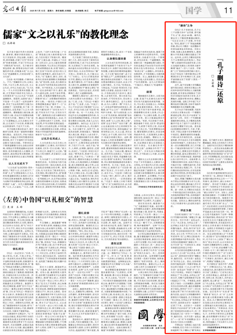 (通讯员 张妍)WILLIAMHILL在线体育投注哲学系王世巍副教授在2025年7月12日出版的《光明日报》第11版发表了题为《“孔子删诗”还原》的理论文章。文章以中共中央总书记习近平“致全国优秀教师代表的信”为指引,锚定中华传统教书育人思想的新时代实践方向,对古典教育家孔子的诗教方法和诗教精神进行了细致的梳理与阐发。该文认为,孔子删定《诗经》的行为不是一项单纯的文献编辑活动,而是为了教育弟子,因而是一个在较长历史周期内的持续性行为。作者根据《论语》中的记载推测,“孔子删诗”的主要活动形式是通过评价传递孔子对某首诗歌的负面态度,连带着从《诗经》中删去了诗歌原文,其实质是以诗文评述和义理训证为主要情景方式的诗教活动。