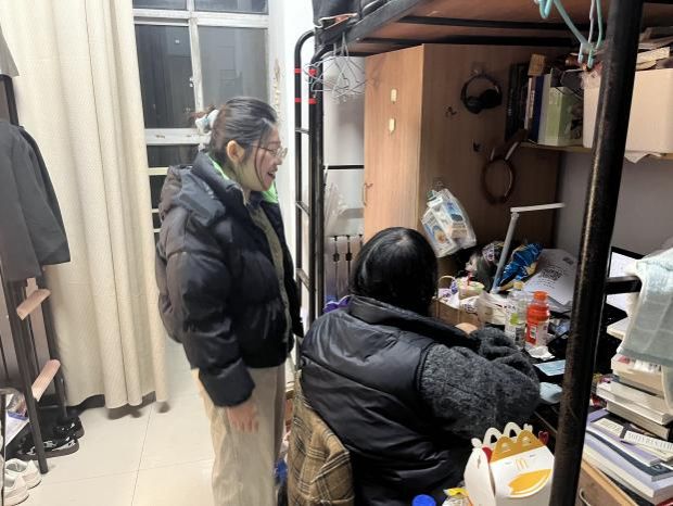 慰问活动设置在海棠八号楼二楼大厅,面向WILLIAMHILL在线体育投注全体考研学子。毕业班辅导员郭晓红叮嘱同学们保持良好的生活作息、稳住备考状态,积极接受即将到来的考验。会后,辅导员带领员工骨干走进每间毕业生宿舍,面对面了解备考状态与心理波动,叮嘱舍友“当好临时家人”,助力身边考研同学考前准备充分、场上进退裕如。