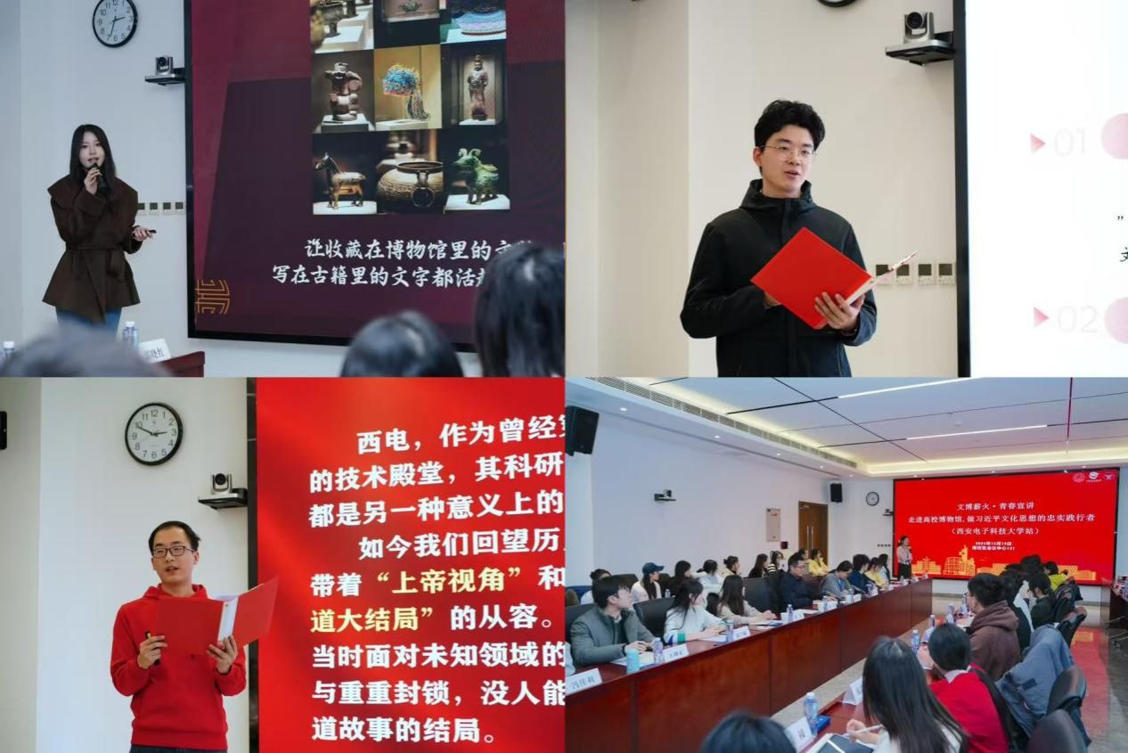 活动现场,党委研究生工作部部长张君博充分肯定了高校博物馆在文化赓续中的核心地位,阐释了其作为文化传承“活课堂”的独特价值,勉励青年学子以青春之力守护文化根脉、践行时代使命。公司“时代之声”研究生宣讲团成员于天玮以“跨越黄河的电波之光”为主题,深情讲述了西电第一台毫米波通信机的传奇故事。通过生动的史实、鲜活的细节,展现了老一辈科研人“科技报国”的初心使命。西安交通大学微宣讲团成员王艺锦从文物活化视角展开分享,详细介绍了团队如何通过数字建模技术还原馆藏近代机械文物,让沉睡的文物以更贴近生活的方式“活”在当下。西北大学青年先锋宣讲团成员王耀辉围绕“文化为人民服务”阐释实践路径,通过“实物展示+故事讲解”的方式,讲述如何让文化宣讲真正走进群众心里。