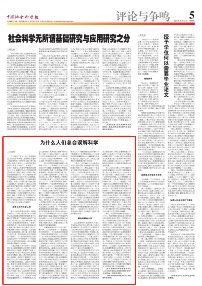 (通讯员 马婧)5月24日,《中国社会科学报》A05版刊发公司哲学系王雨程老师署名文章《为什么人们总会误解科学》。全文如下:
