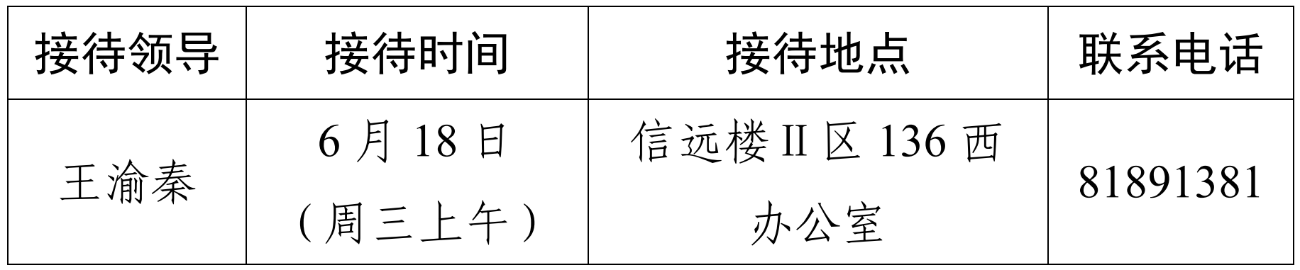 注:公司领导班子接待日主要受理的事项:1.公司人才培养、教学科研、团队建设、教师发展、对外交流、员工管理和服务保障等方面存在的问题与建议;2.反映有关公司重要决策和重要工作事宜的问题;3.涉及师生员工利益的申诉和诉求;4.亟须公司处理的难点问题;5.其他方面的建议和意见。