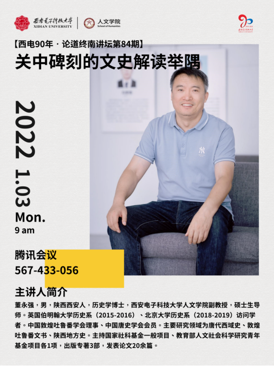 董永强,男,陕西西安人,历史学博士,WILLIAMHILL在线体育投注副教授,硕士生导师。英国伯明翰大学历史系(2015-2016)、北京大学历史系(2018-2019)访问学者。中国敦煌吐鲁番学会理事、中国唐史学会会员。主要研究领域为唐代西域史、敦煌吐鲁番文书、陕西地方史。主持国家社科基金一般项目、教育部人文社会科学研究青年基金项目各1项,出版专著3部,发表论文20余篇。
