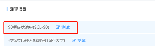 点击“心理测评”图标后,可看到参与测试的量表“90项症状清单”;点击量表名称后面的“铅笔“图标,即可开始测试,如下图: