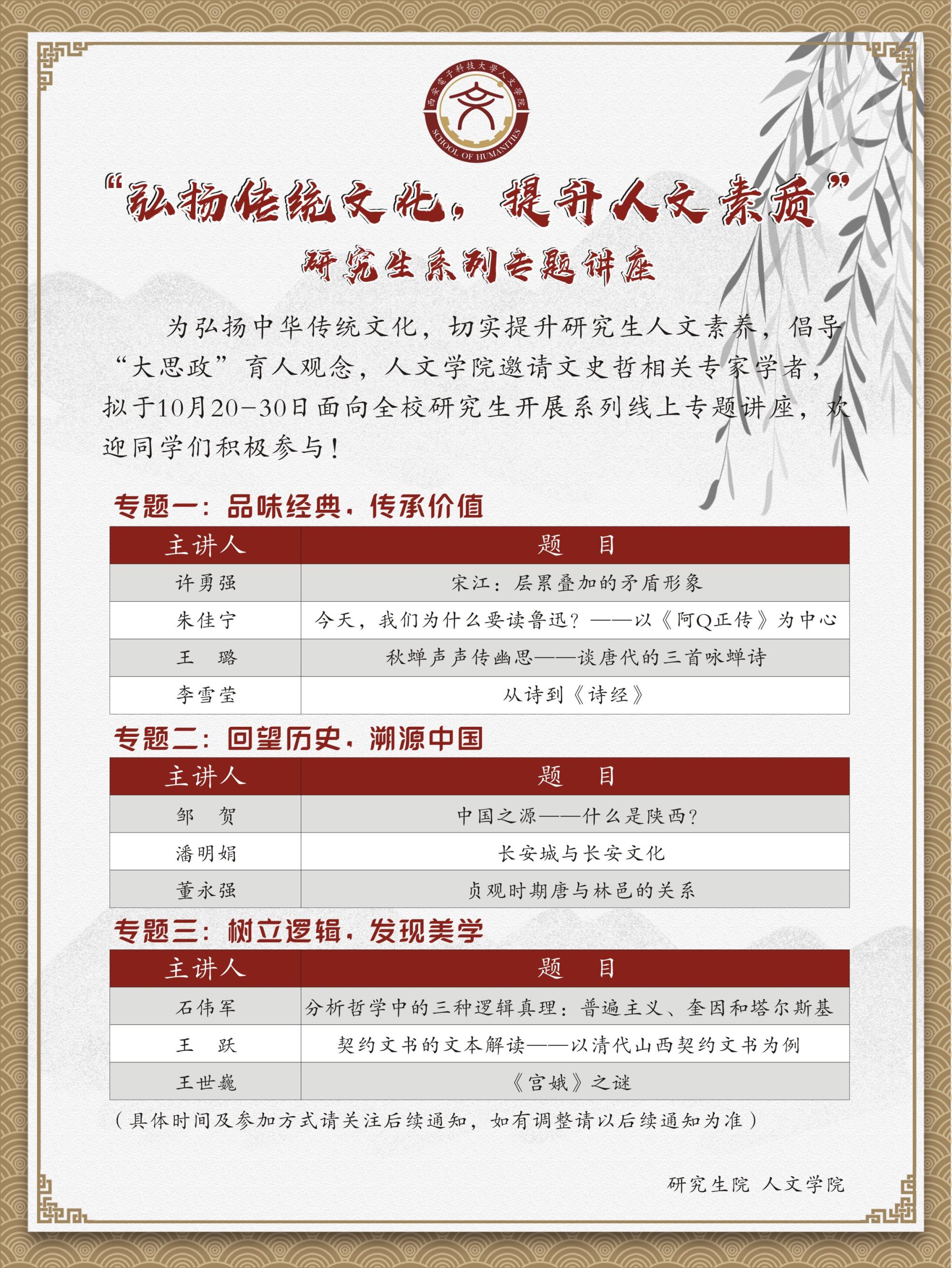 上一篇:讲座预告l“弘扬传统文化,提升人文素质”研究生系列专题讲座(专题一)