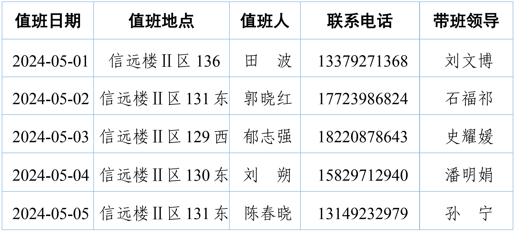 按照公司《关于2024年劳动节放假时间安排的通知》要求,现将公司2024年劳动节假期值班安排如下: