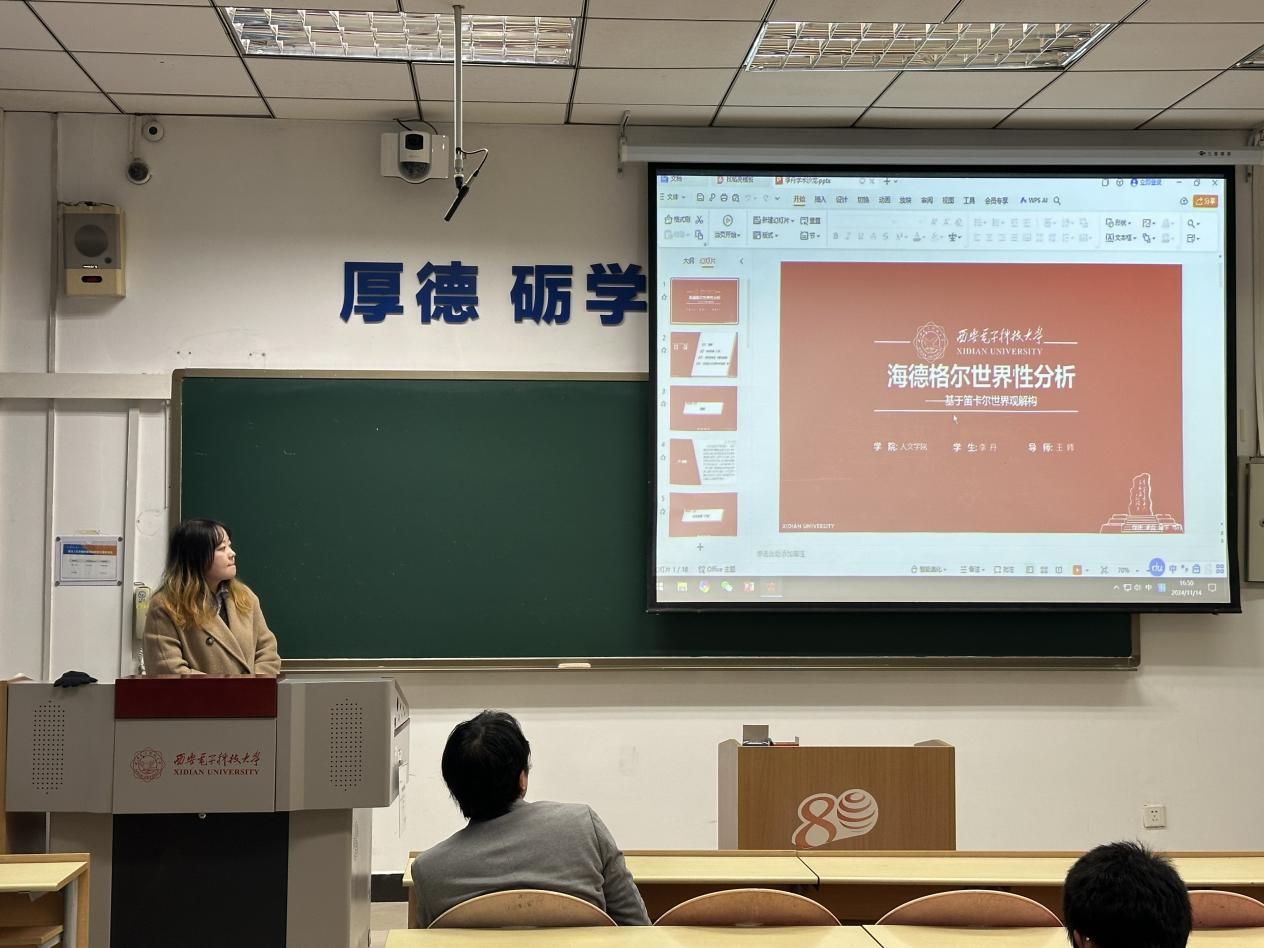 李丹以“海德格尔世界性分析--基于笛卡尔世界观解构”为主题进行了汇报。她从“世界即是‘广延’、‘我思故我在’导致的结果、理性在认识世界中具有唯一性”三个方面详细阐述了海德格尔对笛卡尔世界观的批判,并指出海德格尔在《存在与时间》一书中对笛卡尔的这些观点进行了深刻的反思与解构。海德格尔认为,笛卡尔将世界简化为可量化的广延,忽视了存在的丰富性和多样性。通过这些分析,海德格尔试图揭示一种更加全面和动态的世界观,强调人在世界中的实际生活经验和存在状态对于理解世界的重要性。