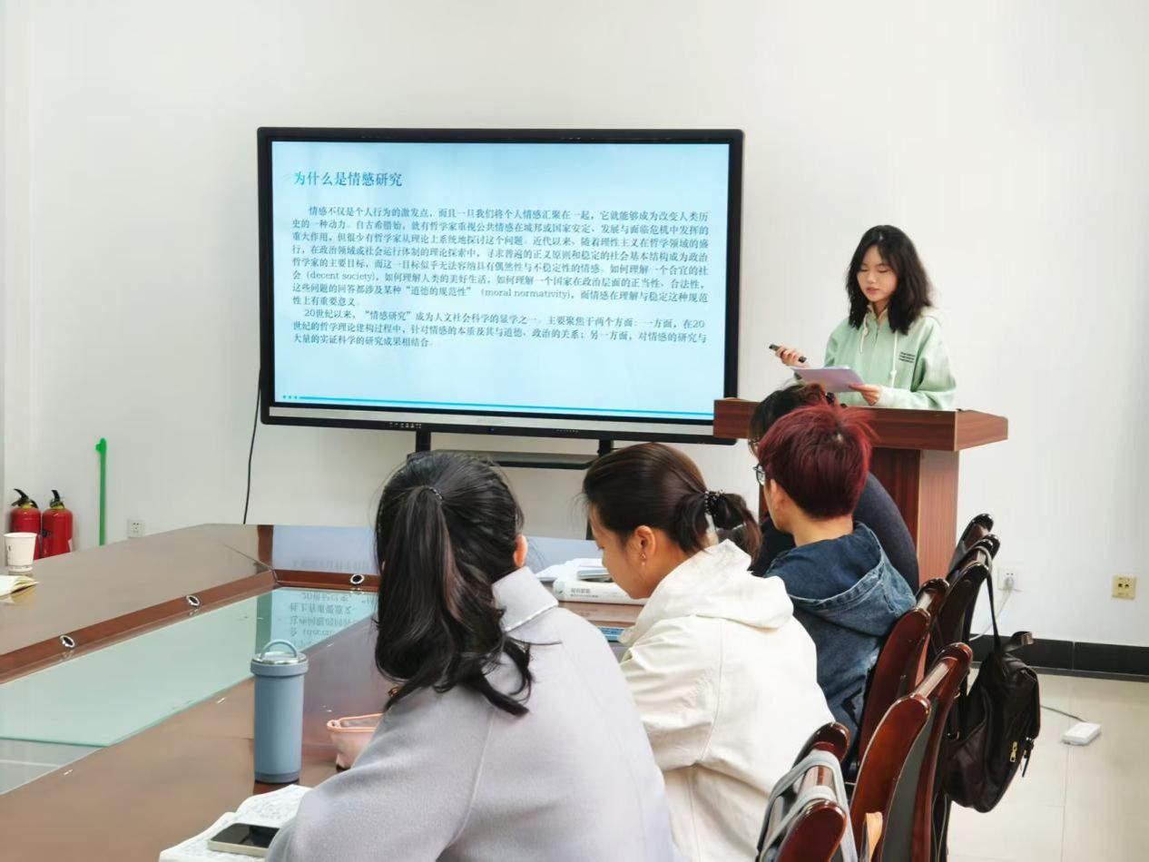 薛睿在《玛莎·努斯鲍姆公共情感研究》报告中,系统梳理了该理论的思想渊源、美学维度与实践路径。通过解构公共情感与文学审美的互动机制,揭示情感认知对实现个人幸福与社会正义的桥梁作用,提出构建情感共同体对促进社会和谐发展的现实意义。颜心怡在评议中肯定了其跨学科研究框架,同时强调核心概念的精准界定对学术表达的重要性。马得林老师对其汇报思路及跨学科的研究方式表示肯定,认为其多媒体演示与流畅的汇报表现展现了扎实的学术素养。