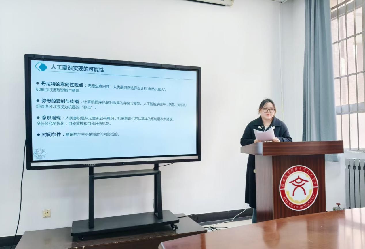 颜心怡以《人工意识实现的可能性探究——基于丹尼特意识理论视角》为题展开汇报。她从人工意识与人类意识的定义切入,探讨“机器是否具有意识”这一人工智能领域的前沿命题。通过援引丹尼特的功能主义理论及达尔文意识论证,提出人类作为自然选择的“自然机器人”,为机器实现智能与意识提供了理论可能性。在评议环节,薛睿在肯定研究逻辑严谨性的同时,建议增加对反方观点的辩证分析。马得林老师高度评价选题的前沿价值,指出丹尼特作为科学哲学领域的标志性学者,其关于机器意识可能性的论证具有重要启示意义,并进一步总结了丹尼特思想的逻辑理路帮助同学深化理解。