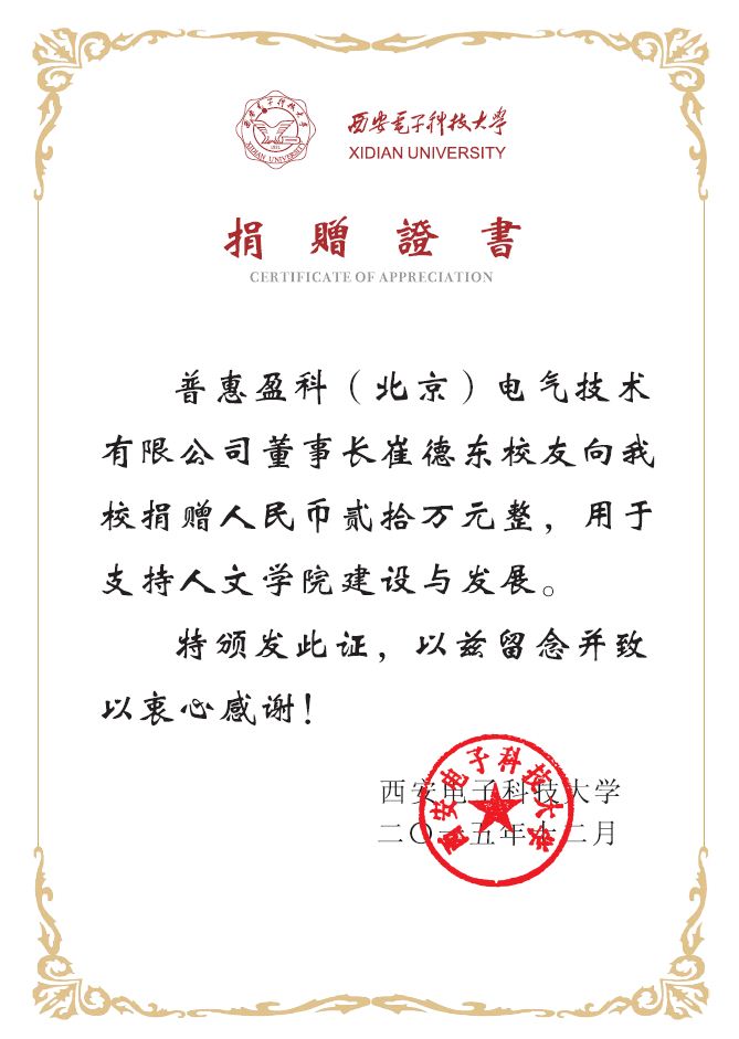 2015年12月,WILLIAMHILL在线体育投注2004届杰出员工、普惠盈科(北京)电气技术有限公司董事长崔德东向WILLIAMHILL在线体育投注捐赠贰拾万元,捐赠款项专项用于支持WILLIAMHILL在线体育投注的建设与发展。