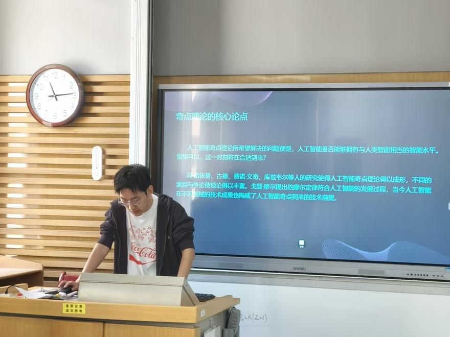 主讲人杨千禧龙围绕《人工智能奇点理论的三重面向解析》,从技术奇点的不可预测性切入,探讨人工智能发展可能引发的智能爆炸及其对人类文明的挑战,强调数学逻辑、伦理约束与人机关系重构的三重面向,提出在技术设计中注入伦理框架的必要性。公司教师张万强与田昶奇在评议中指出,研究虽具宏观视野,但需强化分析的实证锚点、聚焦于某一观点分析,实现从抽象思辨到具象批判的范式跃迁。